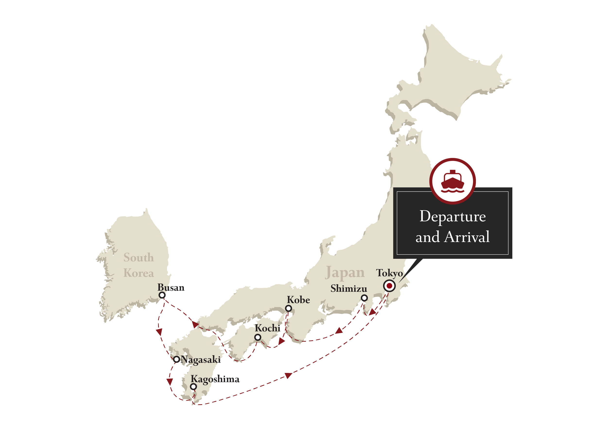 (Tokyo-Shimizu-Kochi-Busan-Nagasaki-Kagoshima-Tokyo)